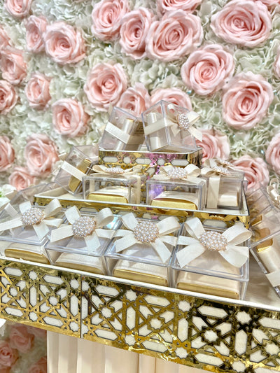 علبة ذهبية تحتوي على 16 قطعة شوكولاتة حليب مخصصة | هدايا الضيوف | مراسم