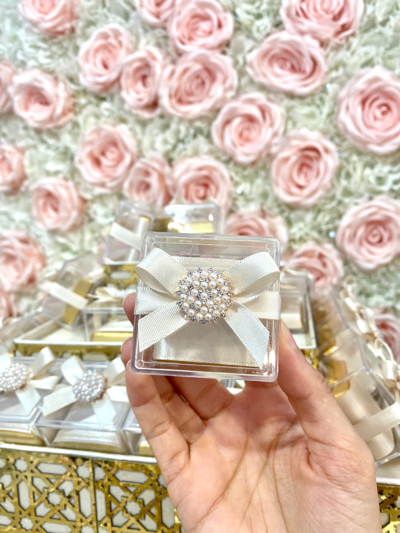 • L'Écrin: Chaque chocolat est délicatement glissé dans une mini-boîte transparente ornée d'un ruban de satin luxueux et d'un bijou étincelant (perles et strass).