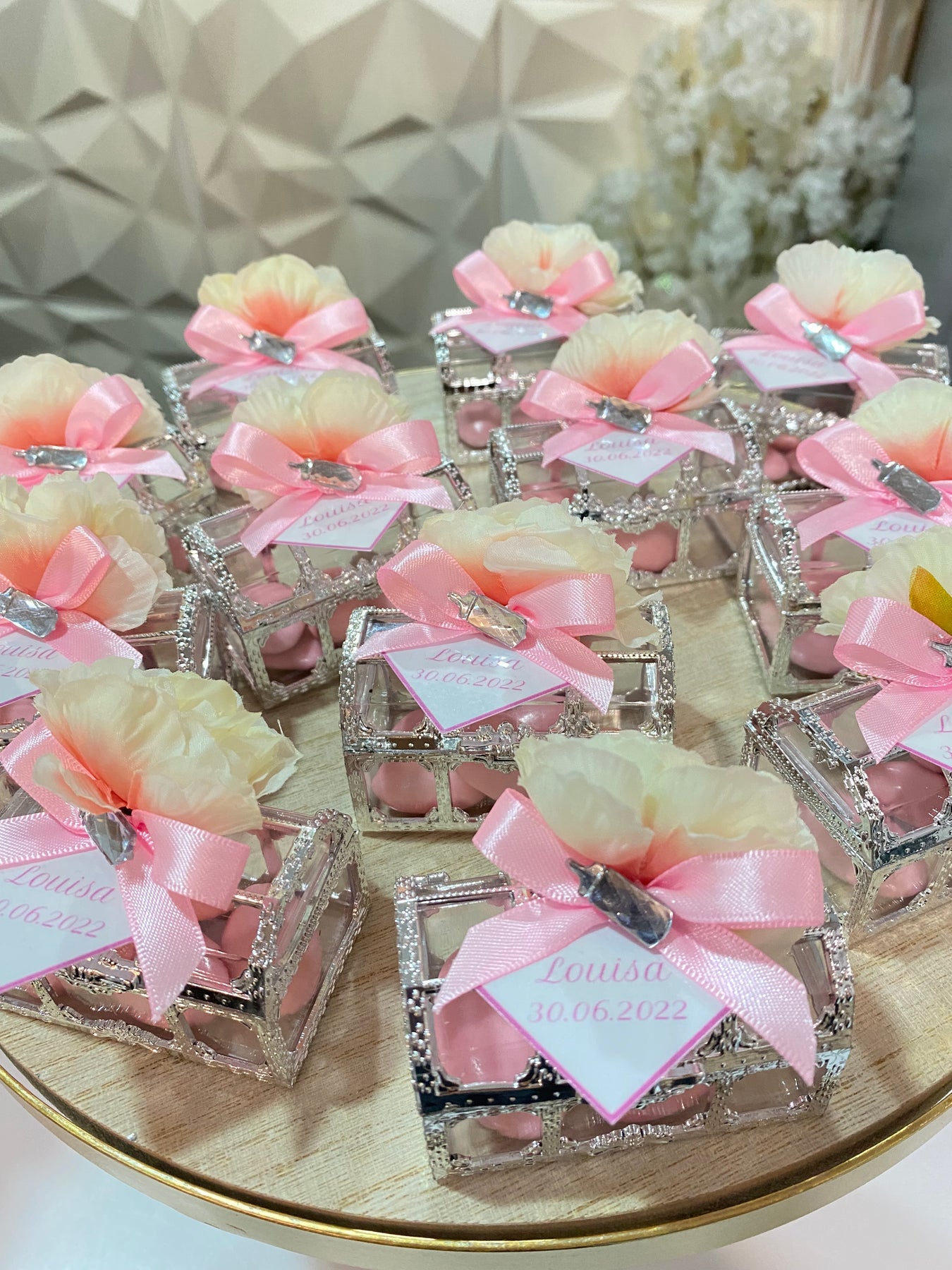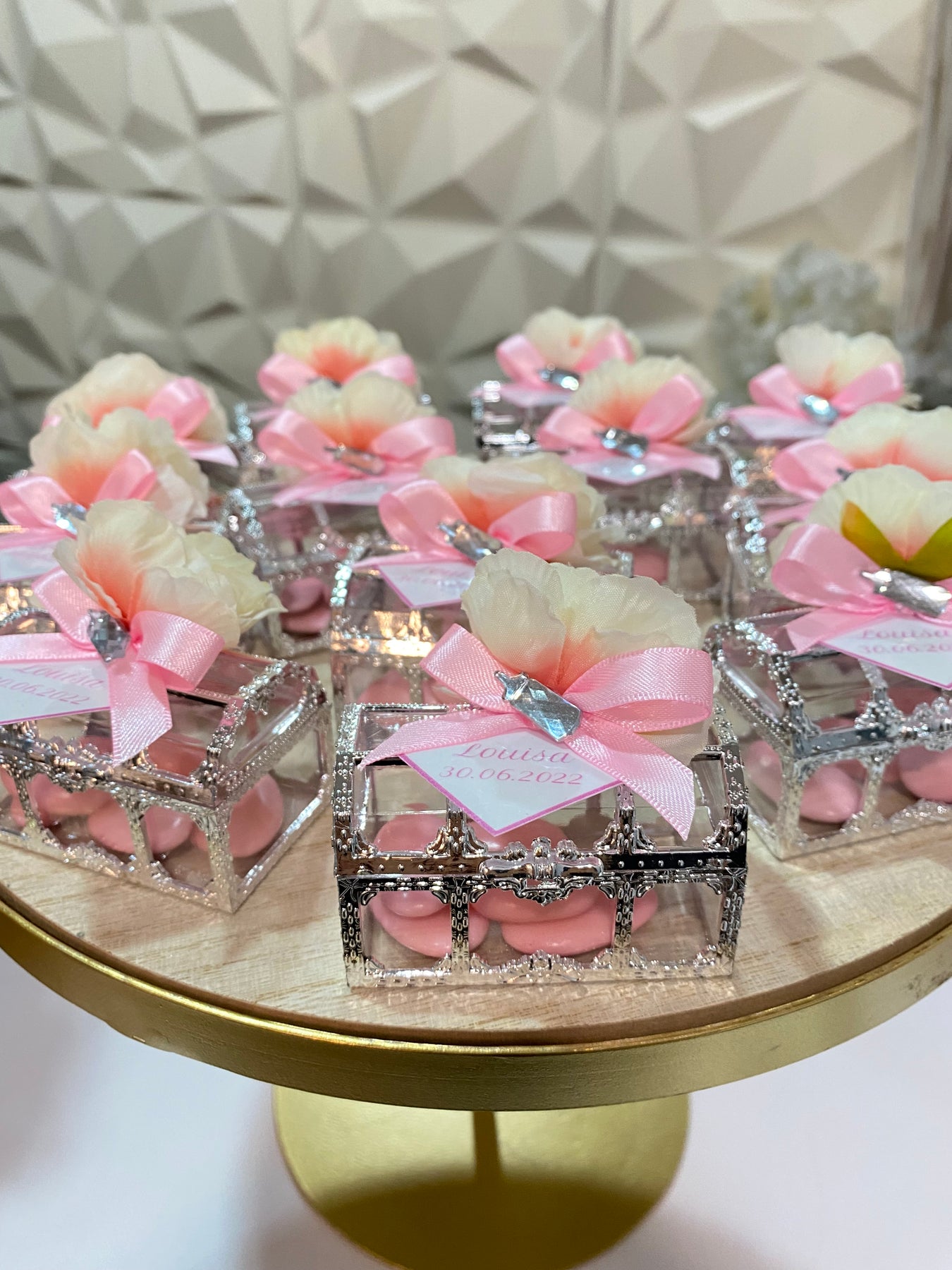 • Design Précieux : La base argentée finement travaillée évoque un trésor miniature, offrant une transparence cristalline pour laisser apercevoir la douceur des dragées roses.