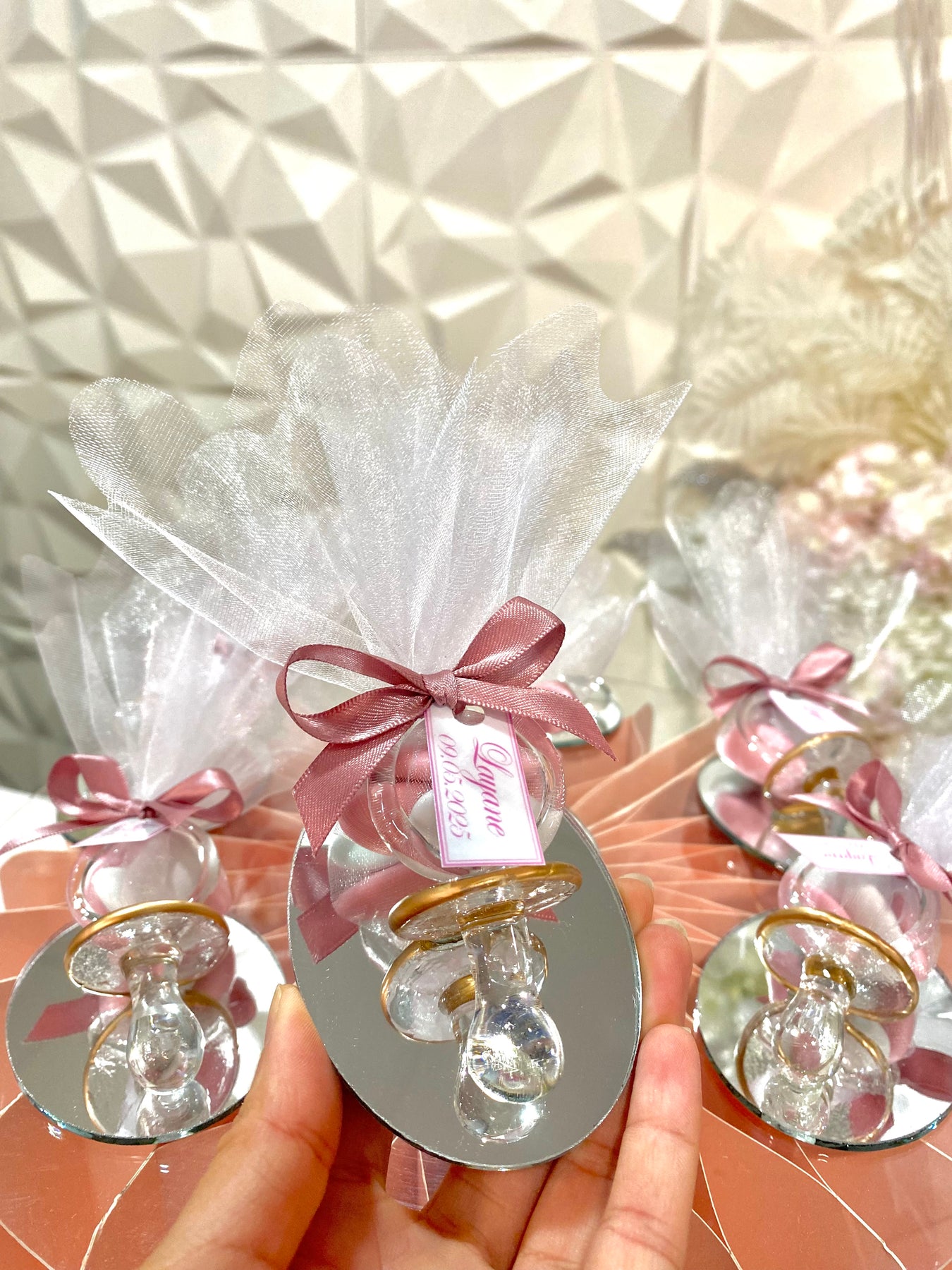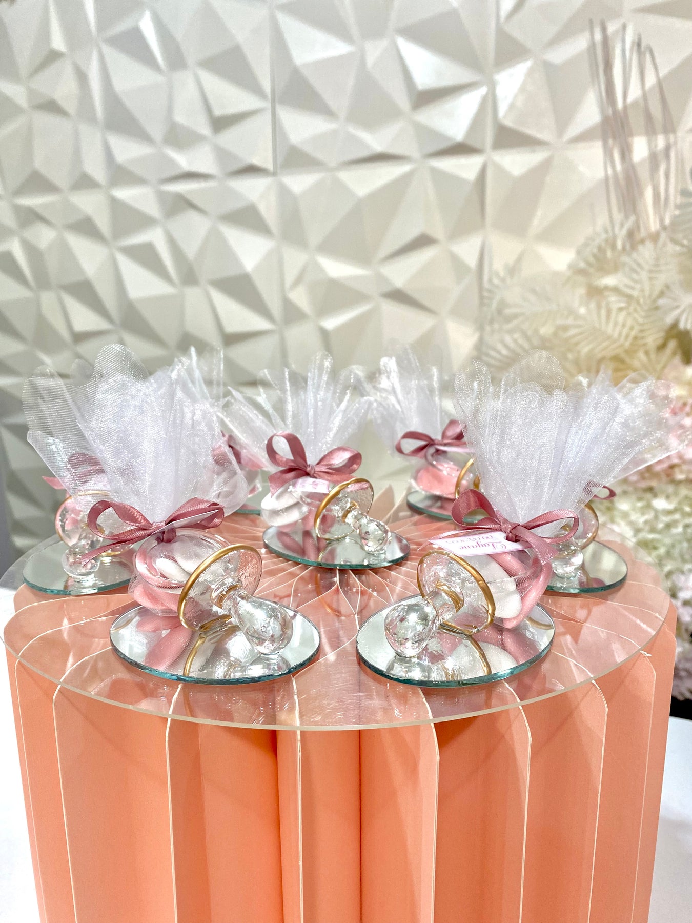 Tétine en verre sur miroir avec tulle à pois blanche garnie de 5 dragées saveurs chocolat rose et blanc.
