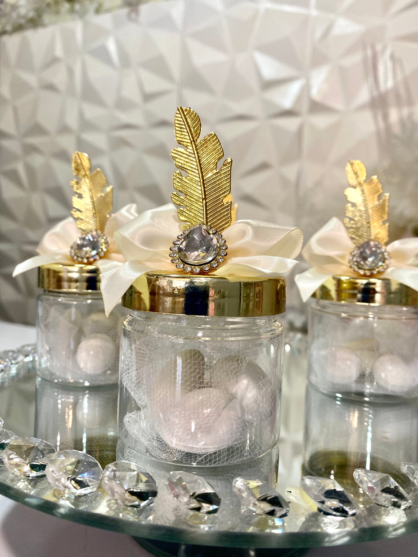 Bonbonnière pvc avec couvercle plume gold, garnie de 3 dragées amandes et 2 dragées chocolat.